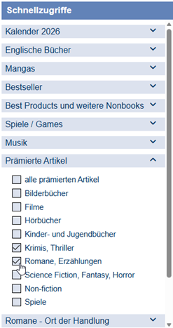 SchnellzugriffeAuf der Startseite sehen Sie in der Mitte des Bibliografie-Fensters die vorhandenen Schnellzugriffe, die sich mit allen anderen Suchfeldern der klassischen Suche kombinieren lassen. Mit Hilfe dieser Filter können Sie Ihre Suche auf bestimmte Kategorien und deren Unterkategorien beschränken. Die Kategorien sind mit UND untereinander verknüpft. Wenn Sie also Sprache = Englisch und Elektronische Medien = CD-ROMs wählen, finden Sie nur noch englischsprachige CD-ROMs. Die Unterkategorien der Schnellzugriffe sind mit ODER untereinander verknüpft. Wenn Sie z. B. unter der Überschrift Spiele sowohl Gesellschaftsspiele als auch Kartenspiele anhaken, finden Sie beide Artikeltypen. So nutzen Sie die Schnellzugriffe: