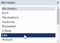 Mit Hilfe des Feldes Medien können Sie die Treffer auf bestimmte Medien wie Hörbücher oder Kalender einschränken. Klicken Sie auf das kleine Dreieck und wählen Sie aus dem Auswahlfenster einen Wert aus.