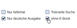 Auch über die Checkboxen im unteren Teil der Suchmaske kann die Trefferanzahl eingeschränkt werden. Dadurch werden beispielsweise nur lieferbare Titel, oder nur deutsche Ausgaben gefunden und/oder E-Books ausgeschlossen.