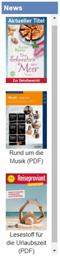 Am rechten Rand des Startfensters finden Sie den Newsbereich. Hier präsentieren wir Ihnen wöchentlich neue Aktionstitel, Top-Neuheiten oder eine Titelliste zu einem aktuellen Thema.