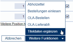 Über den Befehl Titeldaten ergänzen im Menü Weitere Funktionen können die eingegebenen Bestellungen nachbibliografiert werden.